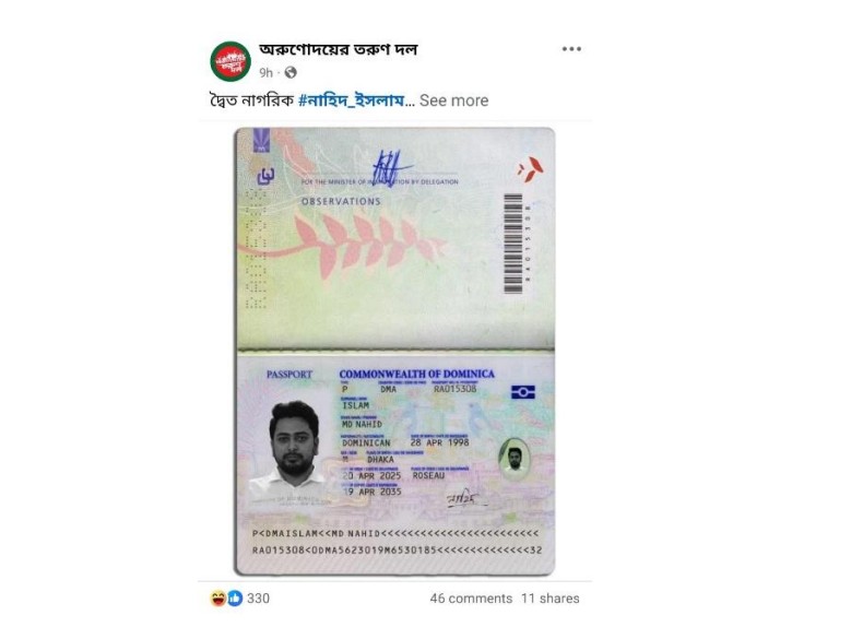 সামাজিক যোগাযোগমাধ্যমে সম্প্রতি একটি দাবি ছড়িয়ে পড়ে যে এনসিপি’র আহ্বায়ক নাহিদ ইসলাম ডোমিনিকার নাগরিকত্ব গ্রহণ করেছেন এবং তার নামে একটি ডোমিনিকান পাসপোর্ট রয়েছে। এই দাবির পক্ষে একটি নথি ও কয়েকটি পাসপোর্টের ছবি প্রচার করা হয়। নথিটির শিরোনাম “নাহিদ ইসলামের ডোমিনিকার পাসপোর্ট প্রসঙ্গে” এবং এতে বলা হয়, একটি ডোমিনিকান পাসপোর্ট যাচাই করে তা ভুয়া প্রমাণ করা সম্ভব হয়েছে ।